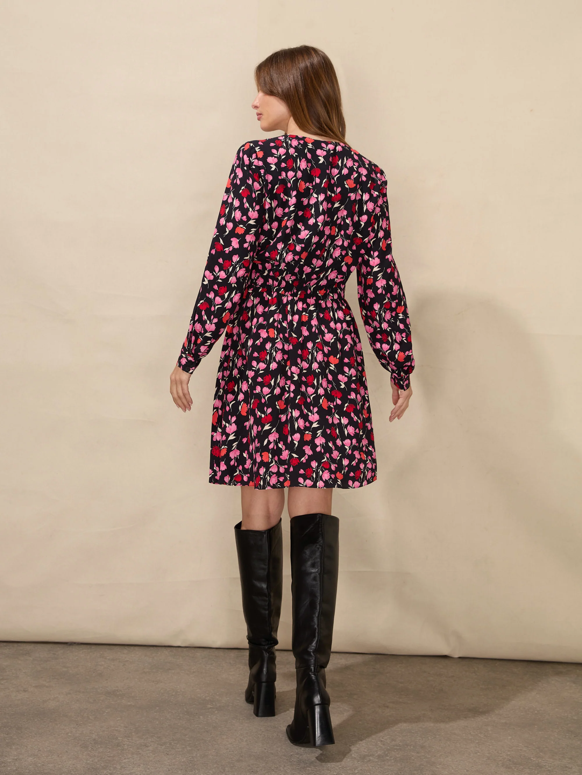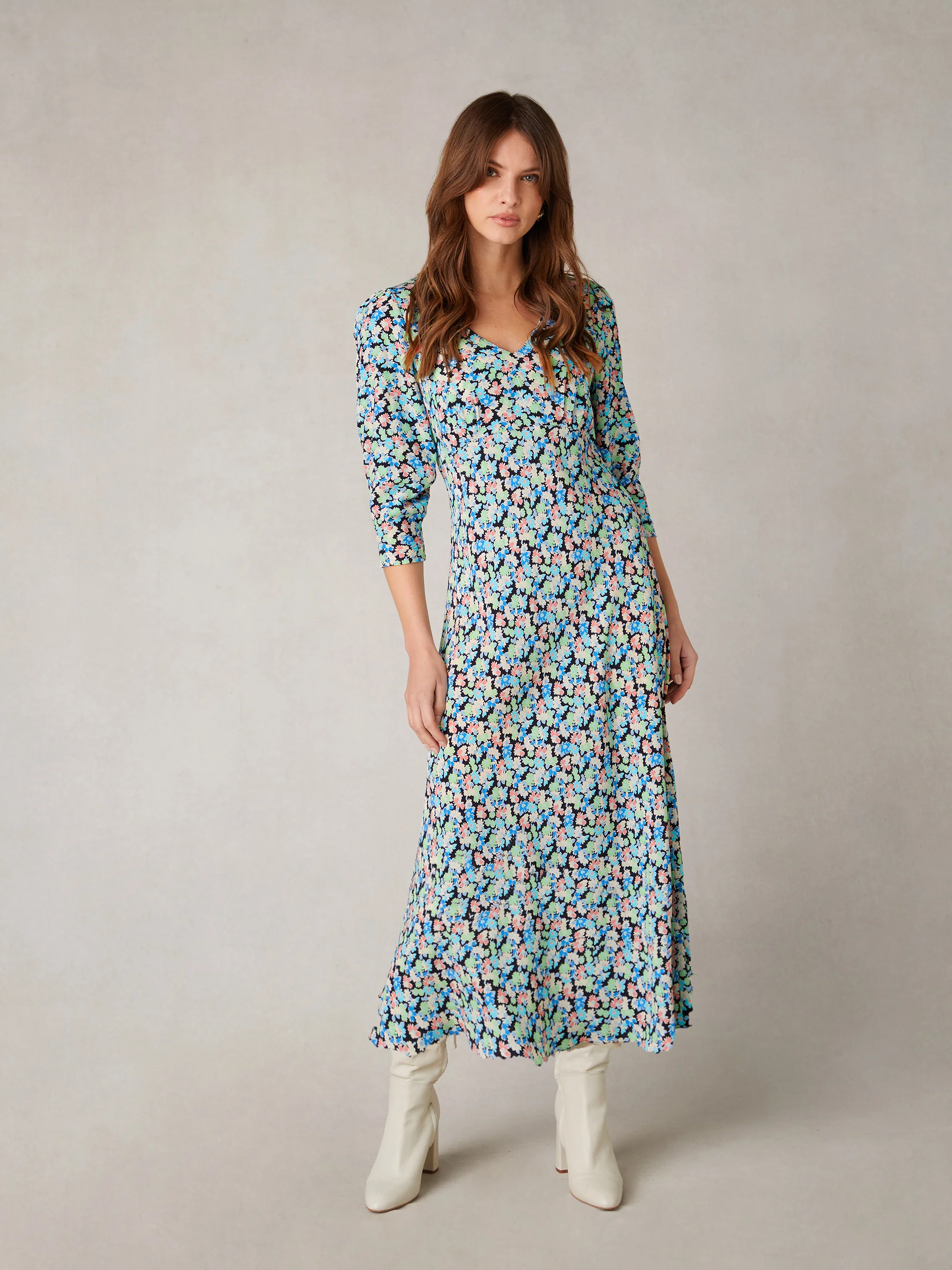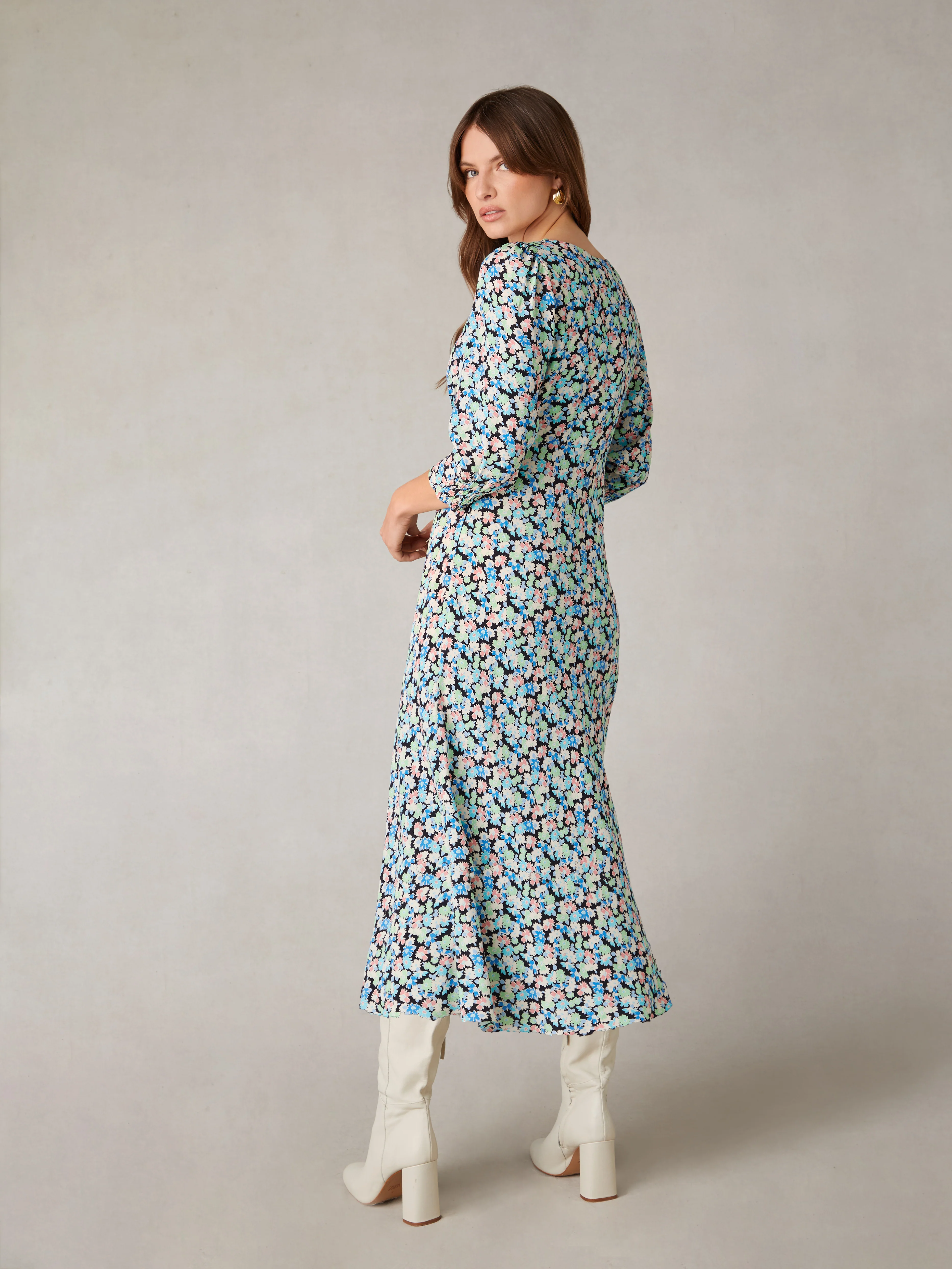 Multi Ditsy Print Shirred Cuff Midi Dress