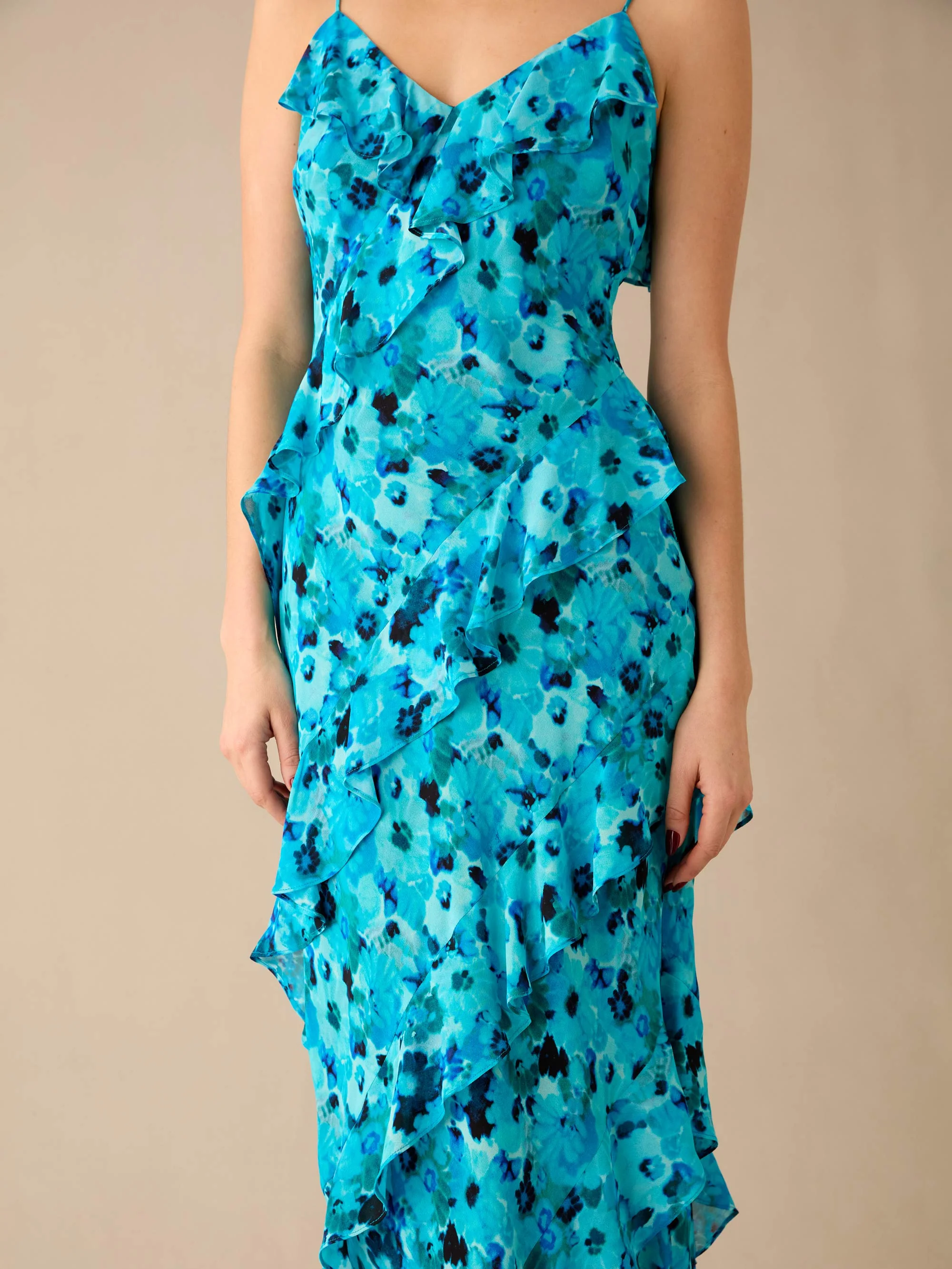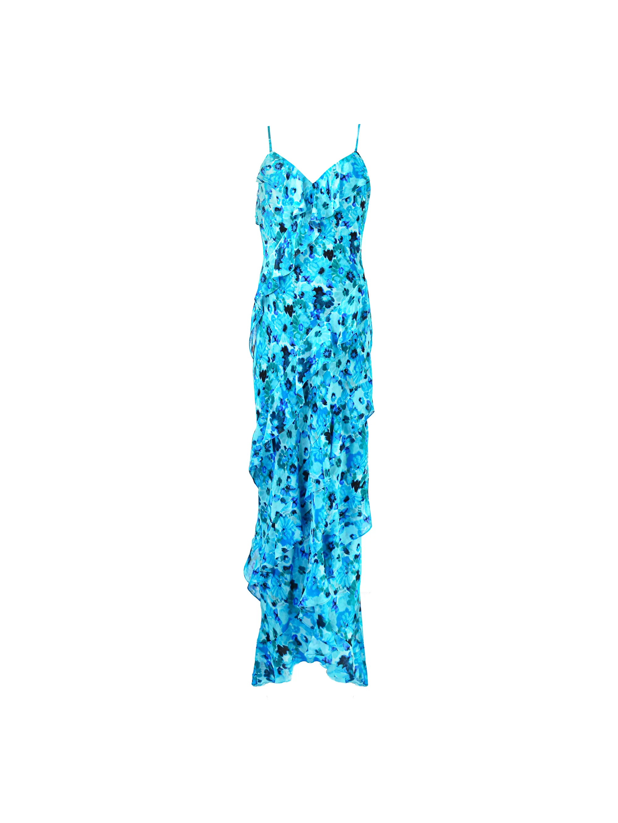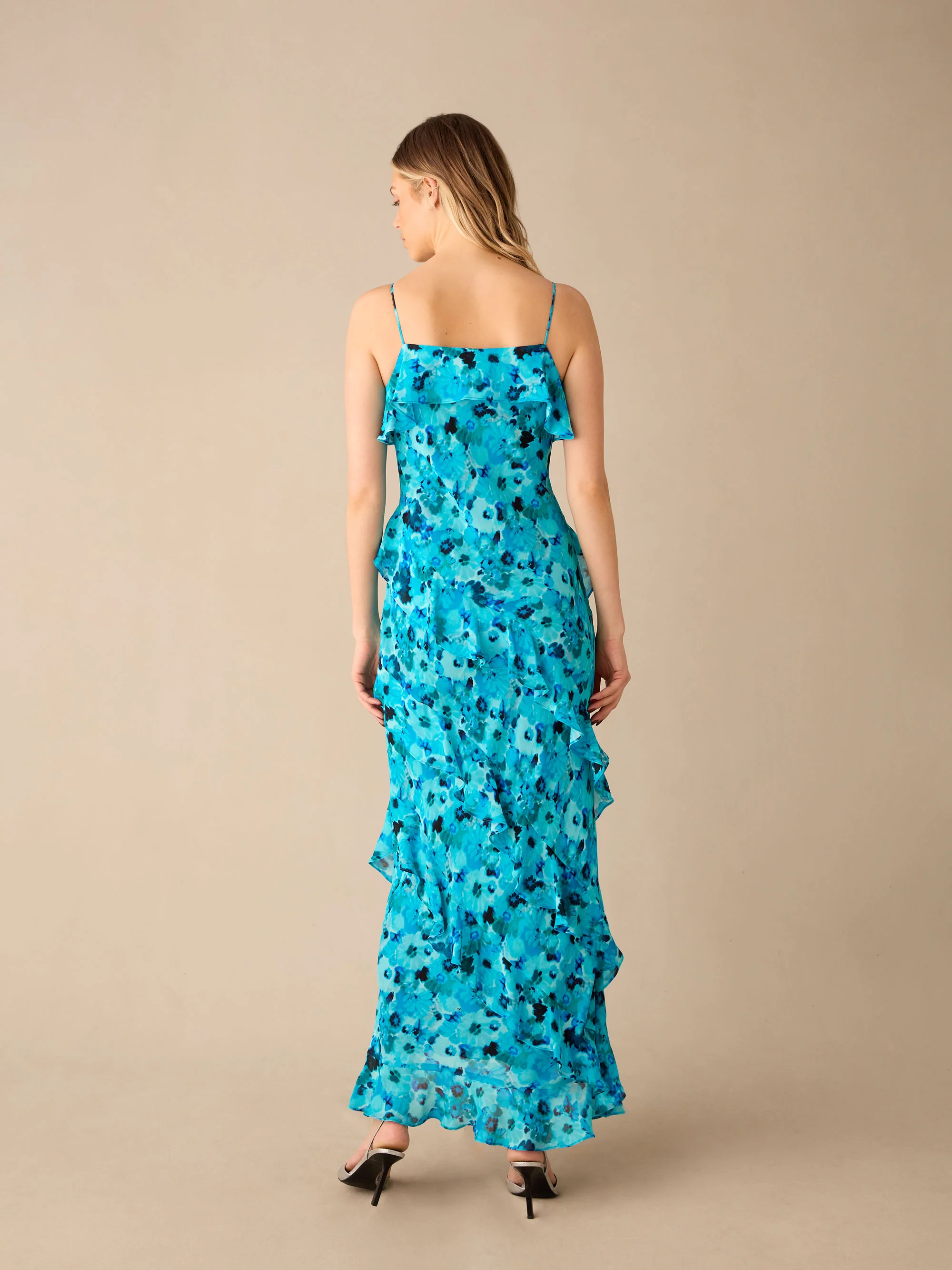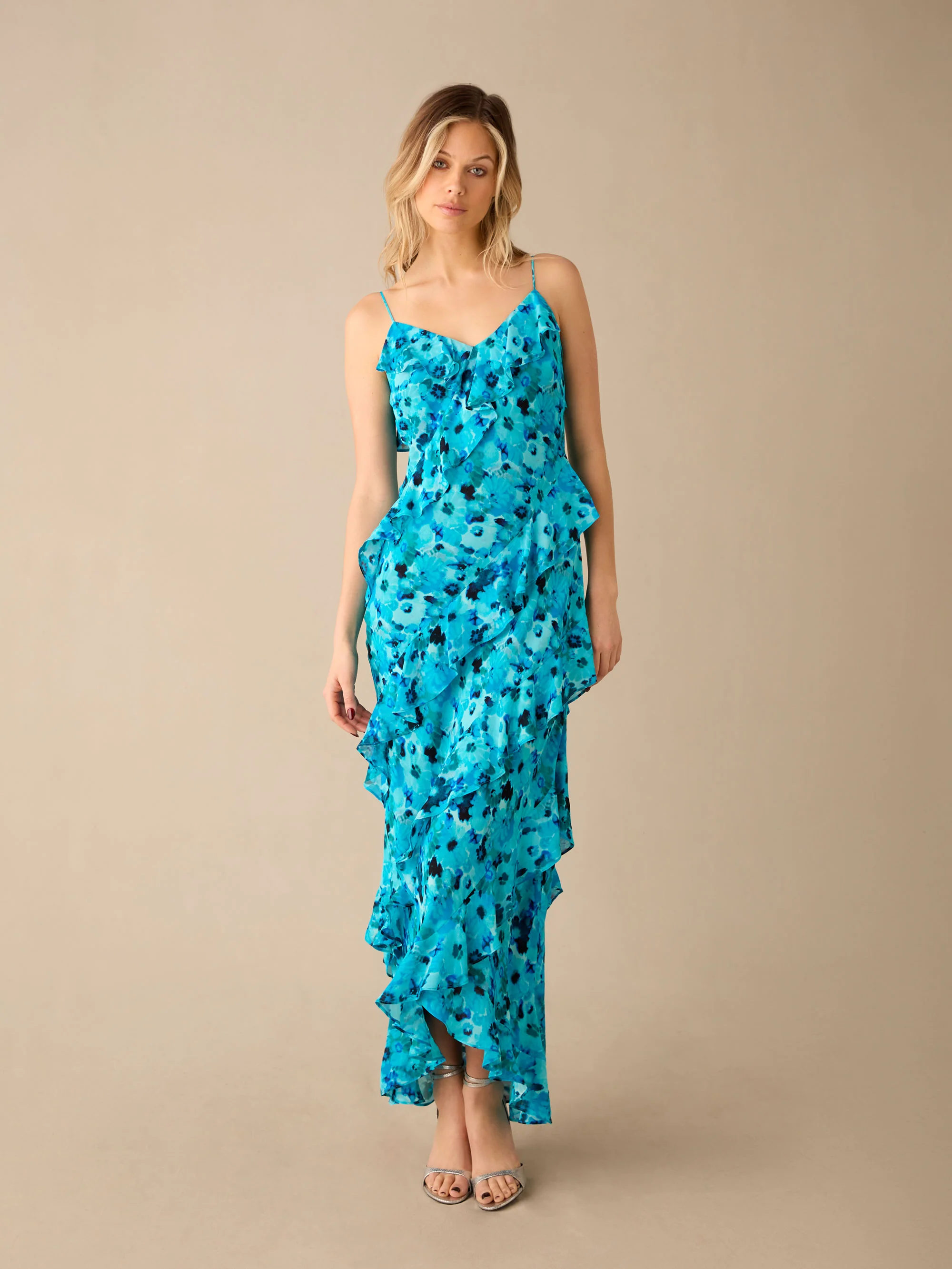 Kirstee Blue Floral Print Ruffle Cami Maxi Dress